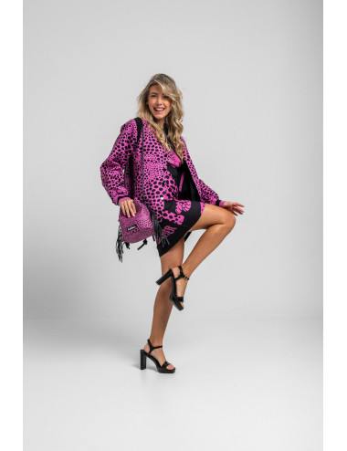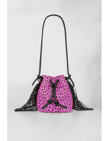 BOLSO BANDOLERA POLIPIEL TIPO SACO CON FLECOS ANIMAL PRINTO ROSA Y NEGRO