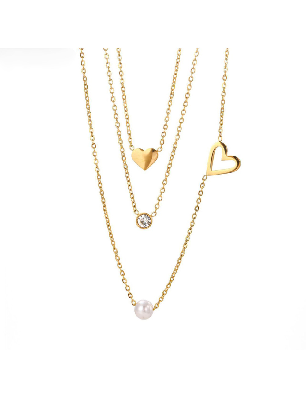 SET DE COLLARES TRIPLE ACERO CON PERLA, CRISTAL Y CORAZONES