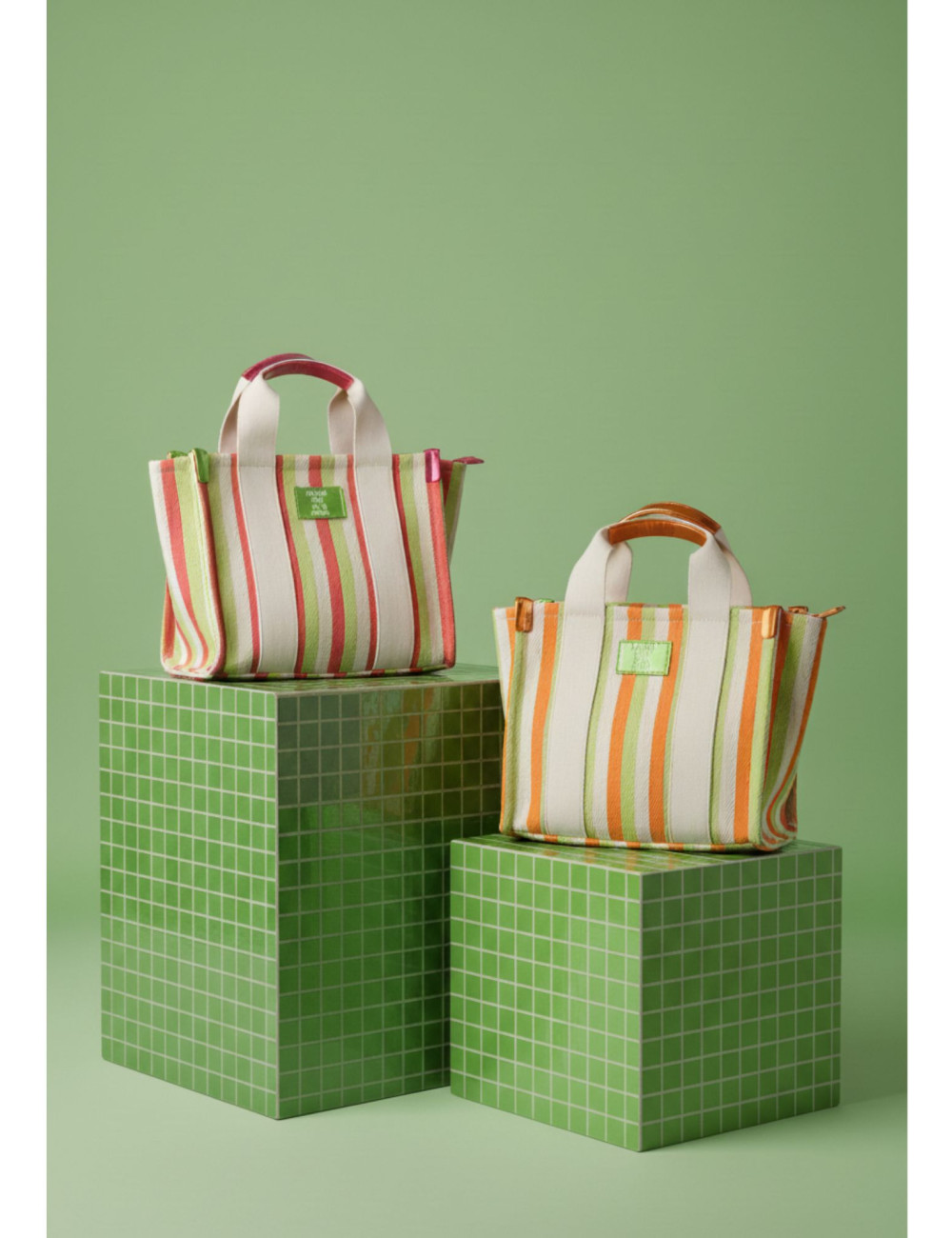 Diseño de líneas de color en combinación verde + naranja o verde + fucsia.
