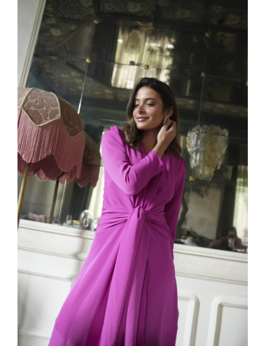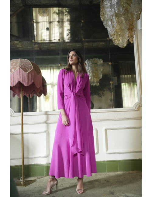 El Vestido Jakie está confeccionado en tejido crepe de alta calidad, con un largo midi que estiliza la figura. Su lazada en la cintura realza la silueta, mientras que el escote en V, las hombreras y el bajo con vuelo aportan feminidad, movimiento y elegancia al conjunto.