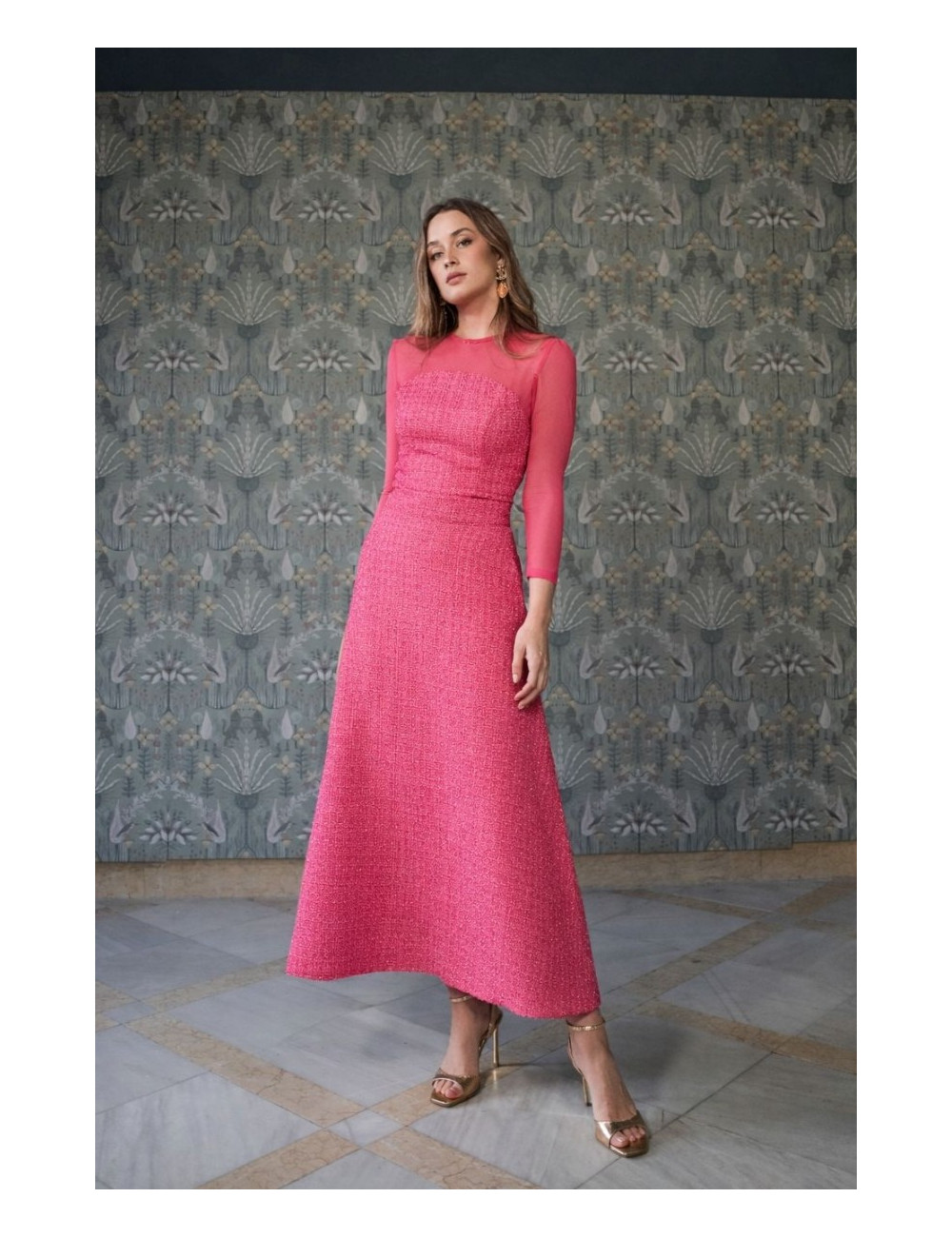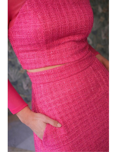 El conjunto Beso está confeccionado en tejido chanel con gasa. El top combinado con gasa aporta delicadeza, mientras que la falda midi de vuelo con forro y bolsillos ofrece comodidad y movimiento. Un conjunto elegante y femenino, ideal para lucir un estilo distinguido en eventos de día, bodas, comuniones o bautizos.