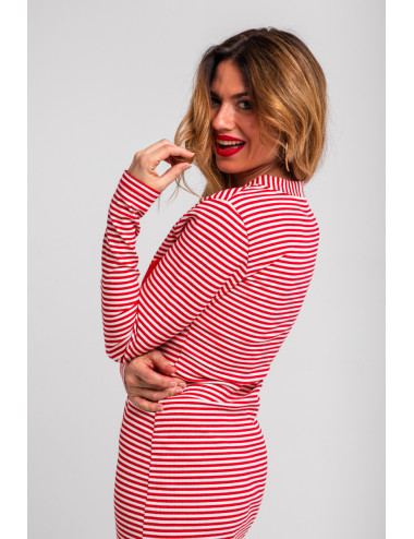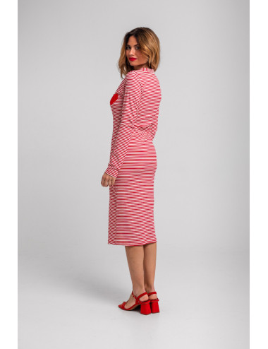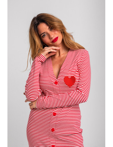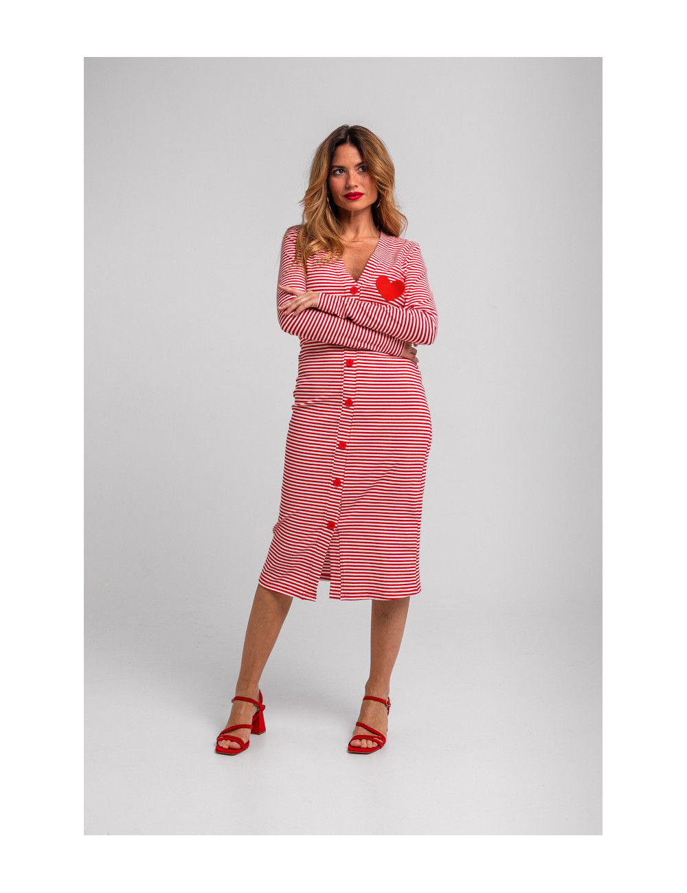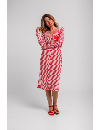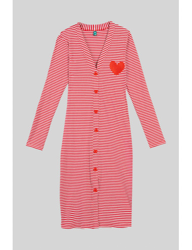 Vestido largo ajustado con escote en V y manga larga rayas blancas, rojas y corazón: Vestido largo de silueta ajustada con escote en V profundo. Presenta mangas largas y abotonadura frontal que se extiende hasta el bajo, donde se abre una abertura central que facilita el movimiento. - 95% Algodón y 5% Elastán. - Lavar a máquina en agua fría. No usar blanqueador. No usar secadora. Secar colgado a la sombra. Planchado a temperatura baja, por debajo de 100 ºC. Planchar del revés. No dejar la plancha parada sobre la prenda. Lavar con colores similares.