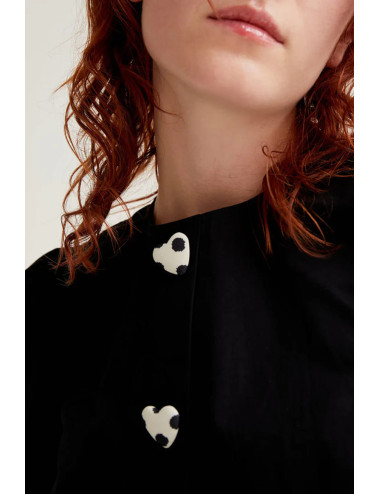 Top de tejido 100% algodón de color negro. Cuello redondo y manga corta ligeramente abullonada. Cierre frontal con botones ocultos con detalle de corazón. La modelo mide 175 cm y lleva la talla S.