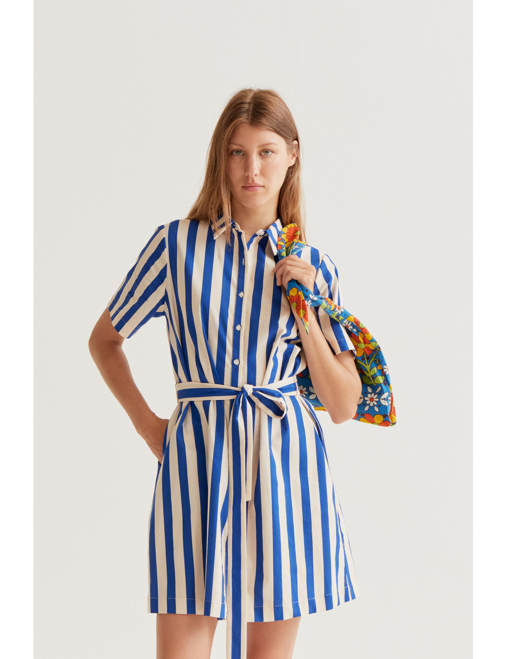 Vestido corto de tejido 100% algodón con estampado bamboo blue. Cuello solapa y manga corta. Cierre frontal con botones de color blanco. Cintura lazada. La modelo mide 177 cm y lleva la talla S.