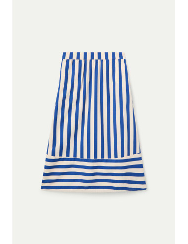 Falda midi de tejido 100% algodón con estampado de bamboo blue. Cintura fija elástica de tiro alto. Detalle de contraste en rayas horizontales en la parte inferior. La modelo mide 173 cm y lleva la talla S.