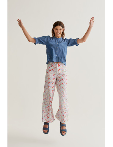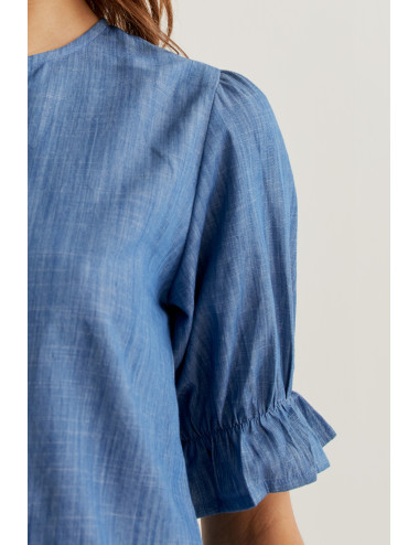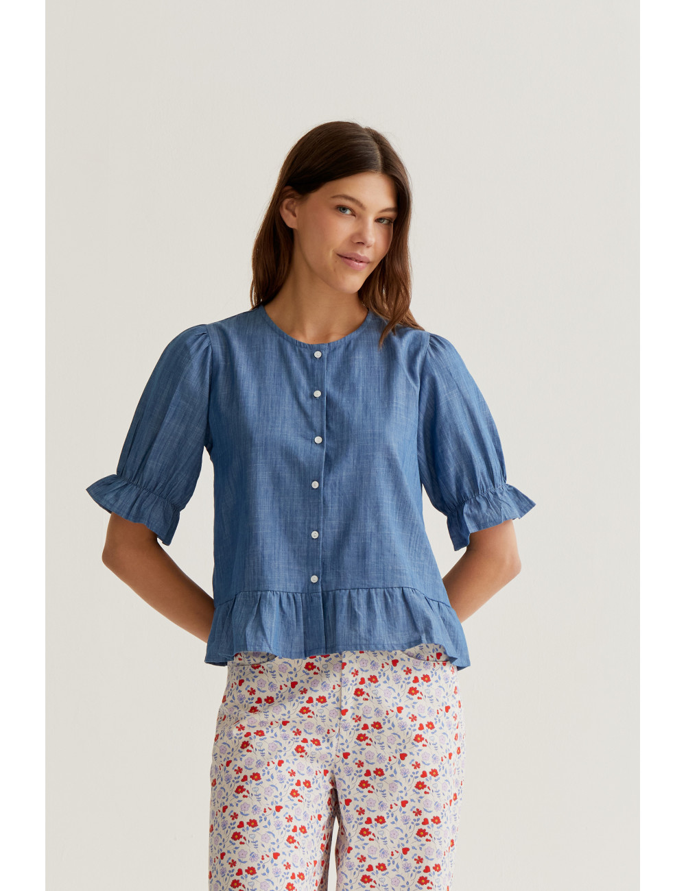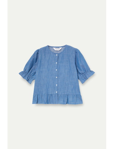 Camisa con tejido 100% algodón chambray de color azul claro. Cuello redondo y manga 3/4 ligeramente abullonada terminada en ajuste elástico con volante. Cierre frontal con botones de color blanco. Detalle de volantes. La modelo mide 177 cm y lleva la talla S.