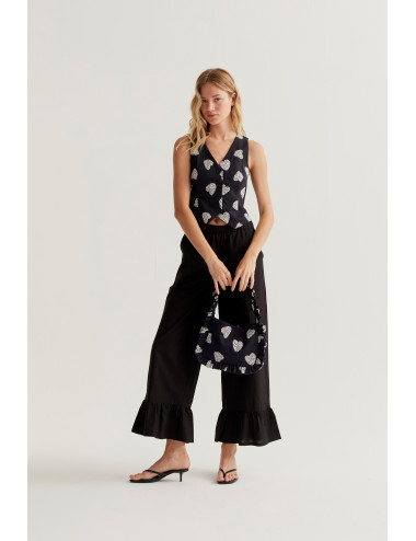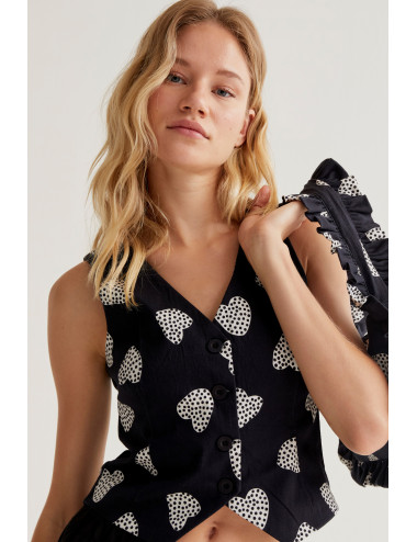 Chaleco de tejido 98% de algodón elástico con estampado harmony black. Escote pico y sin mangas. Cierre frontal con botones de color rojo.Forro interior. La modelo mide 173 cm y lleva la talla S.