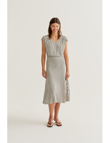 Falda midi de tejido jersey viscoso con estampado de rayas de color negro. Cintura fija elástica de tiro alto. Corte fluido. La modelo mide 177 cm y lleva la talla S.