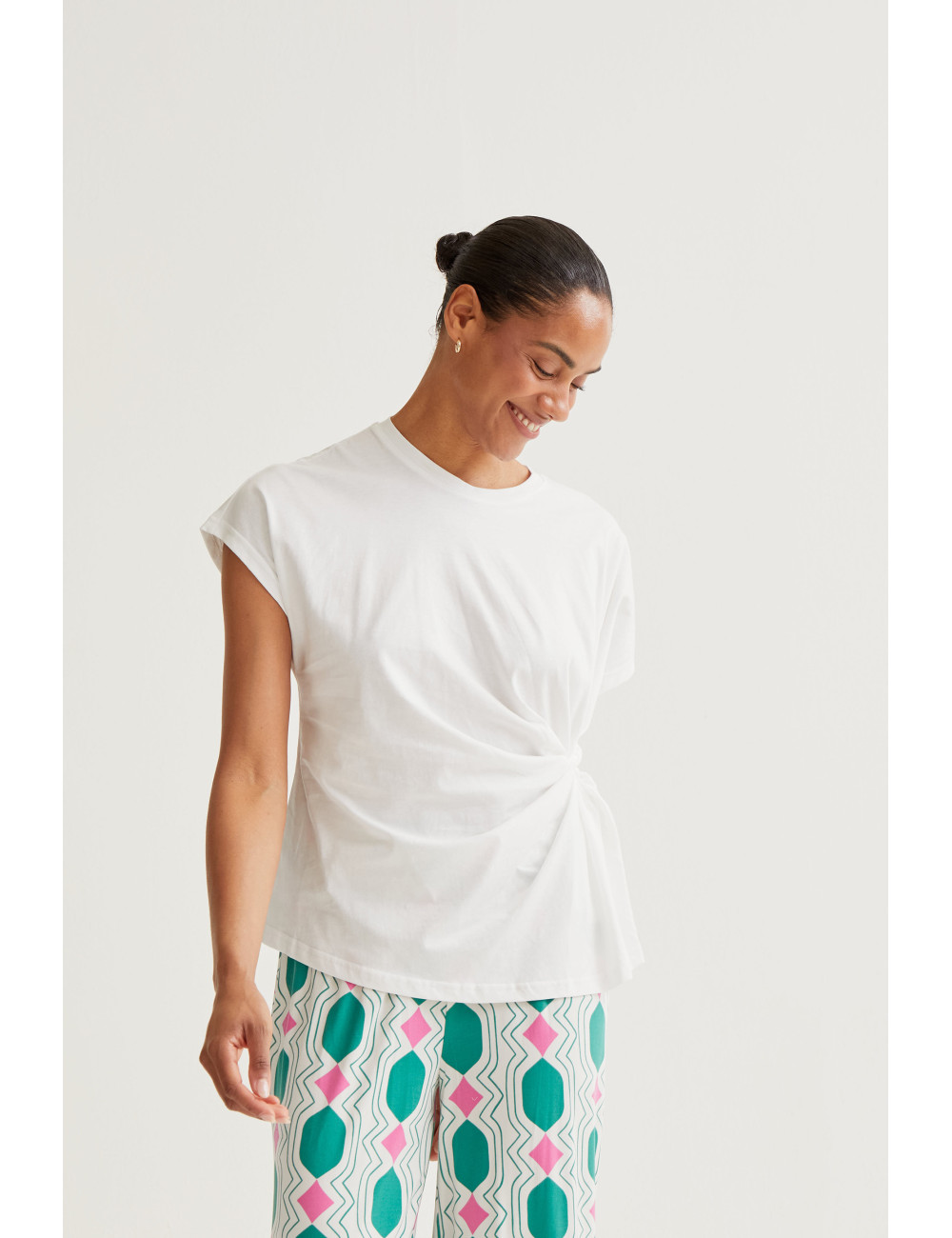 Camiseta de tejido 100% algodón de color blanco. Cuello redondo y manga corta. Cintura drapeada con nudo lateral. La modelo mide 177 cm y lleva la talla S.