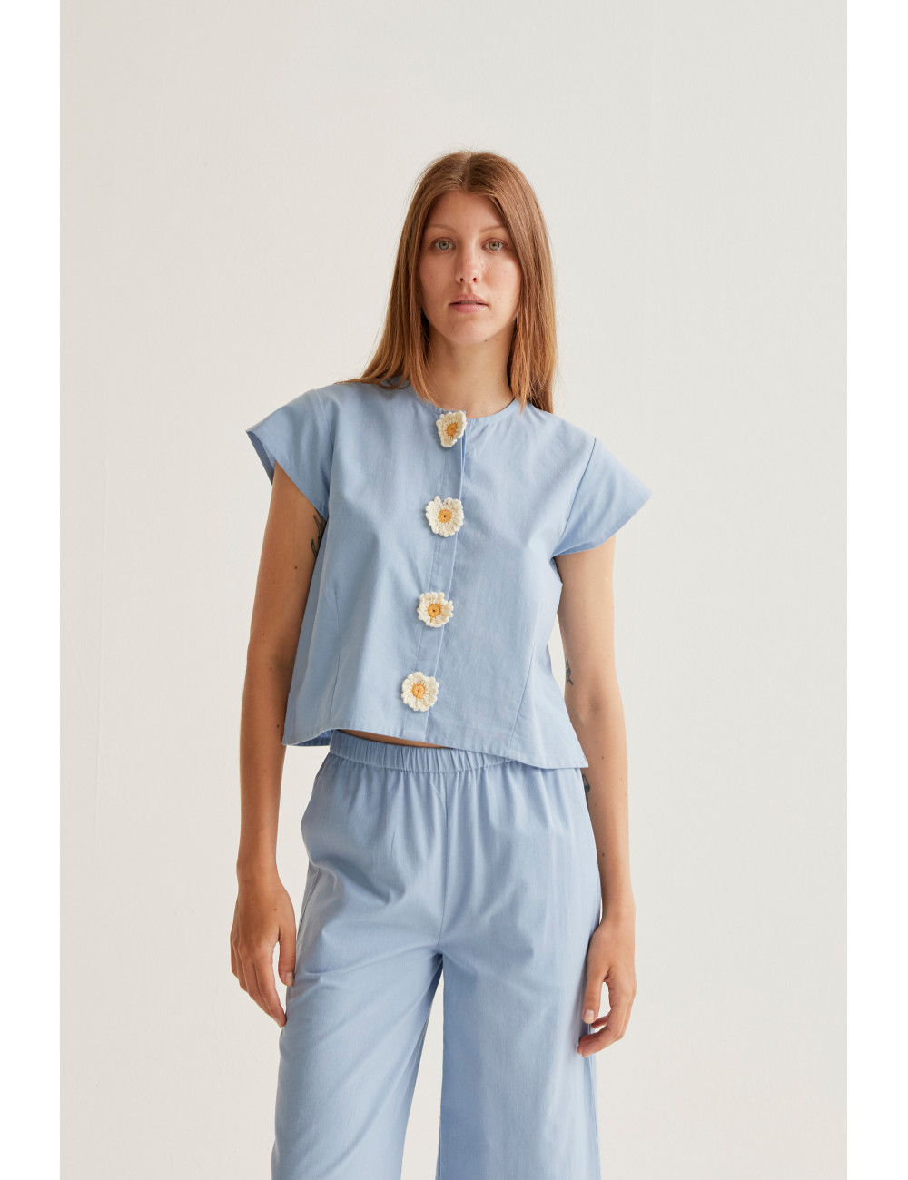 Camisa de tejido 100% algodón de color azul claro. Cuello redondo y manga corta. Cierre frontal con botones ocultos con detalles de margaritas. La modelo mide 177 cm y lleva la talla S.