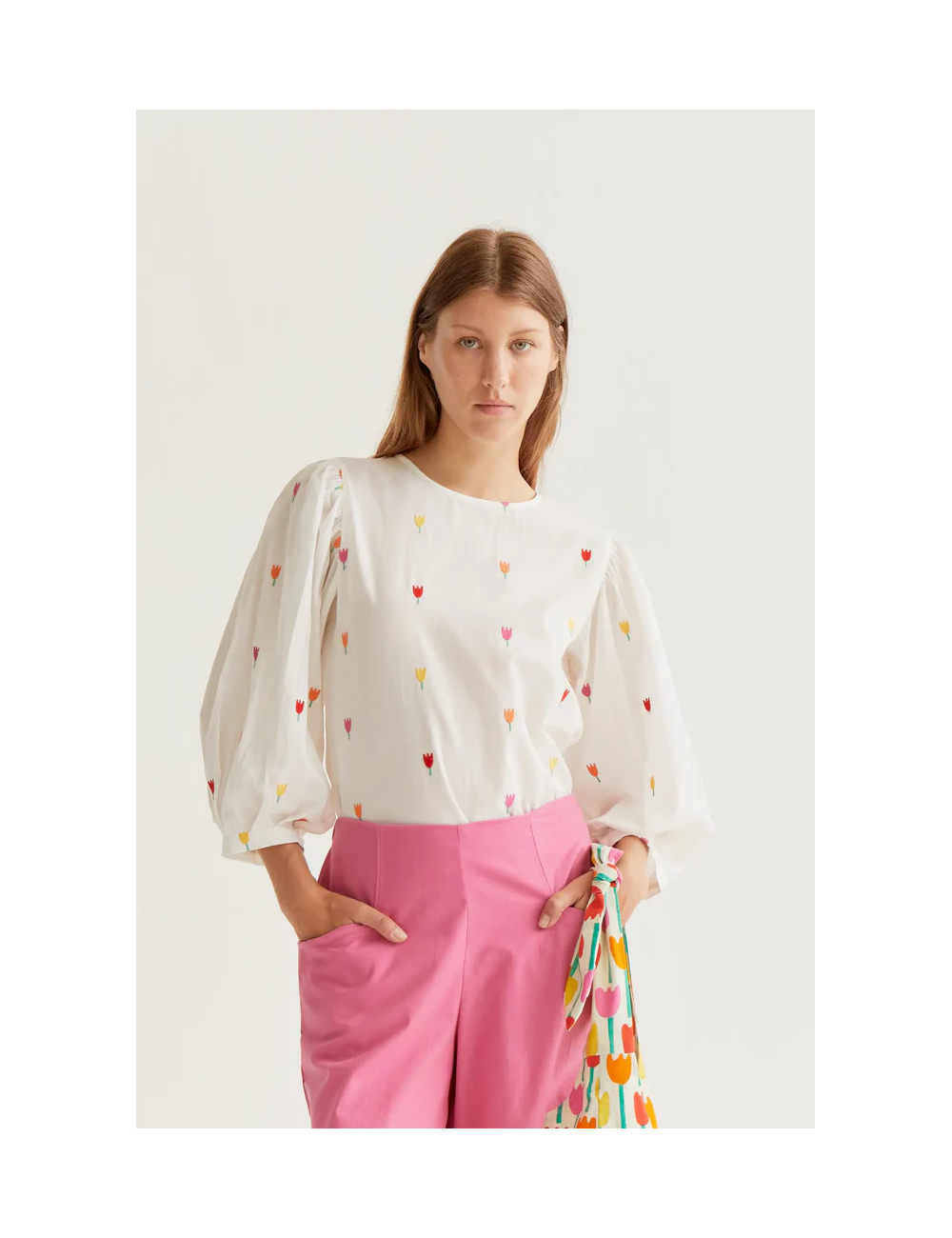 Top de tejido 100% algodón con estampado multi tulip. Cuello redondo y manga larga abullonada. Cierre posterior con botón oculto. La modelo mide 177 cm y lleva la talla S.