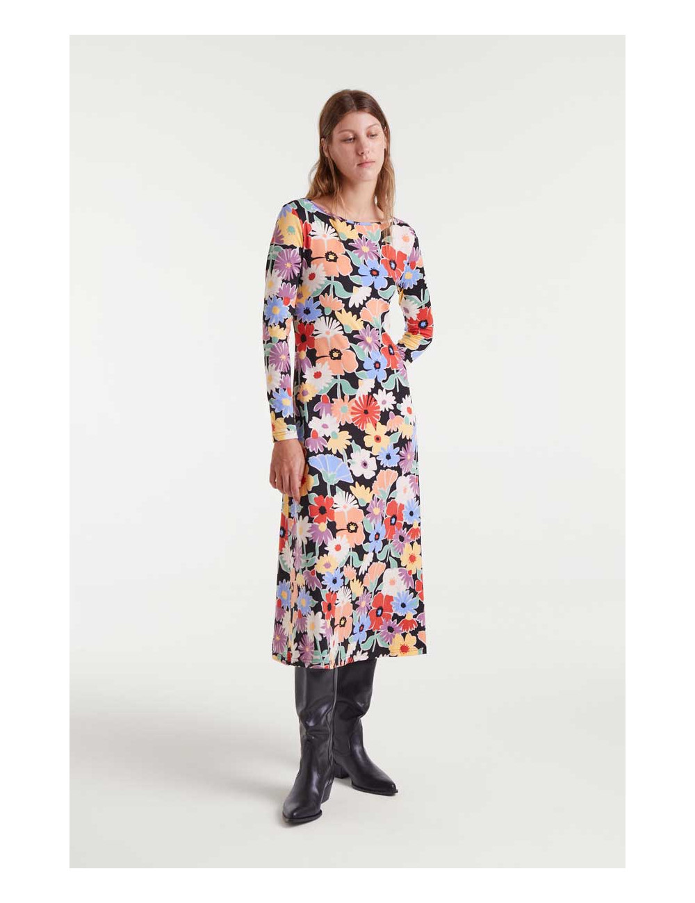 Vestido midi con estampado Hampton Big. Con escote barco y manga larga. Detalle de abertura lateral. La modelo mide 177 cm y lleva la talla S.