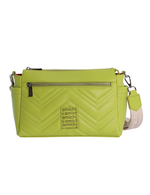 Bolso bandolera para mujer Amichi de polipiel verde con cremallera, con asa bandolera larga de nylon beige logotipada, extensible y extraíble. Tiene cierre de cremallera, dispone de tres bolsillos interiores, dos delante y uno detrás con cremallera, y de dos bolsillos exteriores, uno delante y otro detrás. Logotipo estampado sobre una pieza rectangular de piel sintética verde en la parte inferior central.