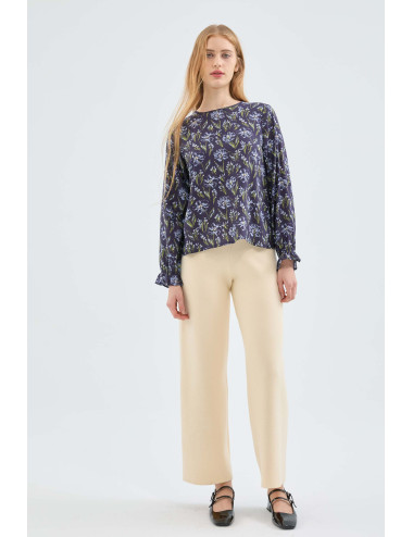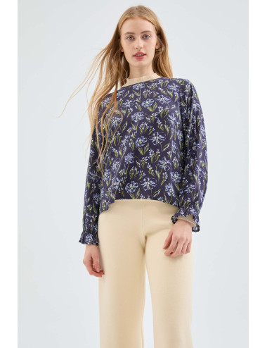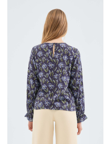 Blusa en viscosa LENZING™ ECOVERO™ con estampado de flores azul. Con cuelo redondo y manga larga terminada en elástico. Cierre trasero con abertura y botón. La modelo mide 173 cm y lleva la talla S.