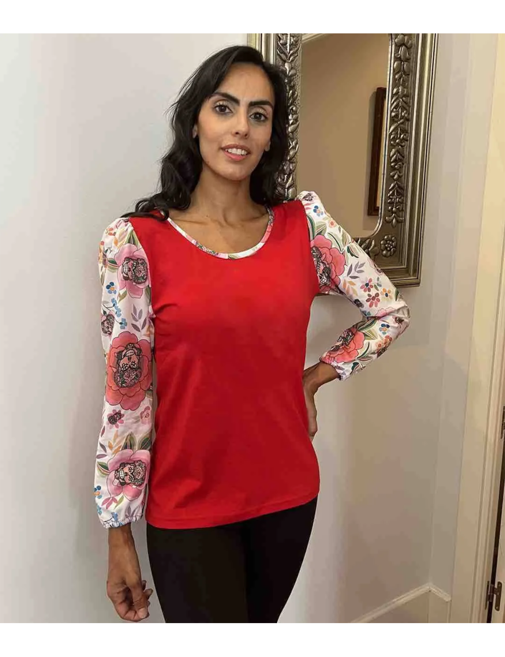 Es de algodón con cuello redondo rematado con tejido a juego de las mangas, que son abullonadas recogidas con goma en la muñeca y de estampado Manila.