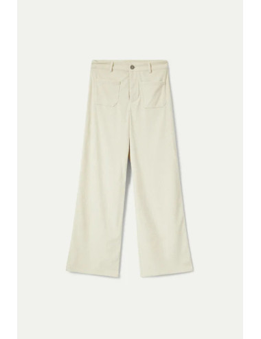 Pantalón largo de pana de color blanco. Con cintura de tiro medio y pernera recta. Cierre con botón y cremallera. Detalle de bolsillos frontales y trabillas para el cinturón. La modelo mide 175 cm y lleva la talla S.