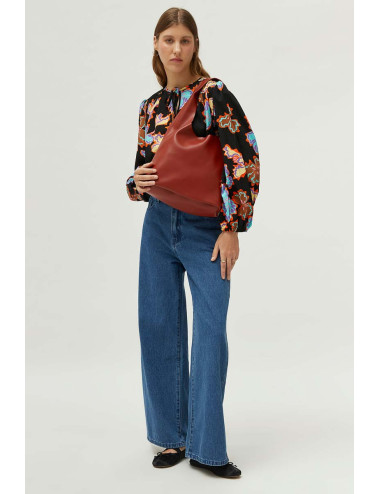 Top en crepé texturizado de color negro con estampado de flores azules, amarillas y marrones. Con cuello redondo y manga larga. Cierre con lazada en el cuello. La modelo mide 176 cm y lleva la talla S.