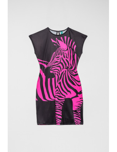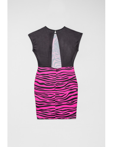 Vestido mini espalda al aire: Vestido mini ajustado en tejido fluido elástico. Diseñado con abertura en la espalda, cuello redondo y manga sisa.